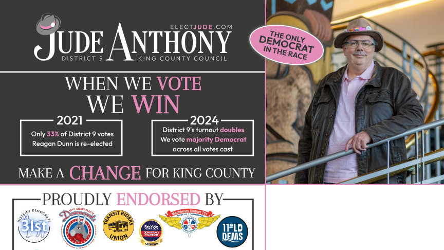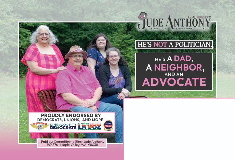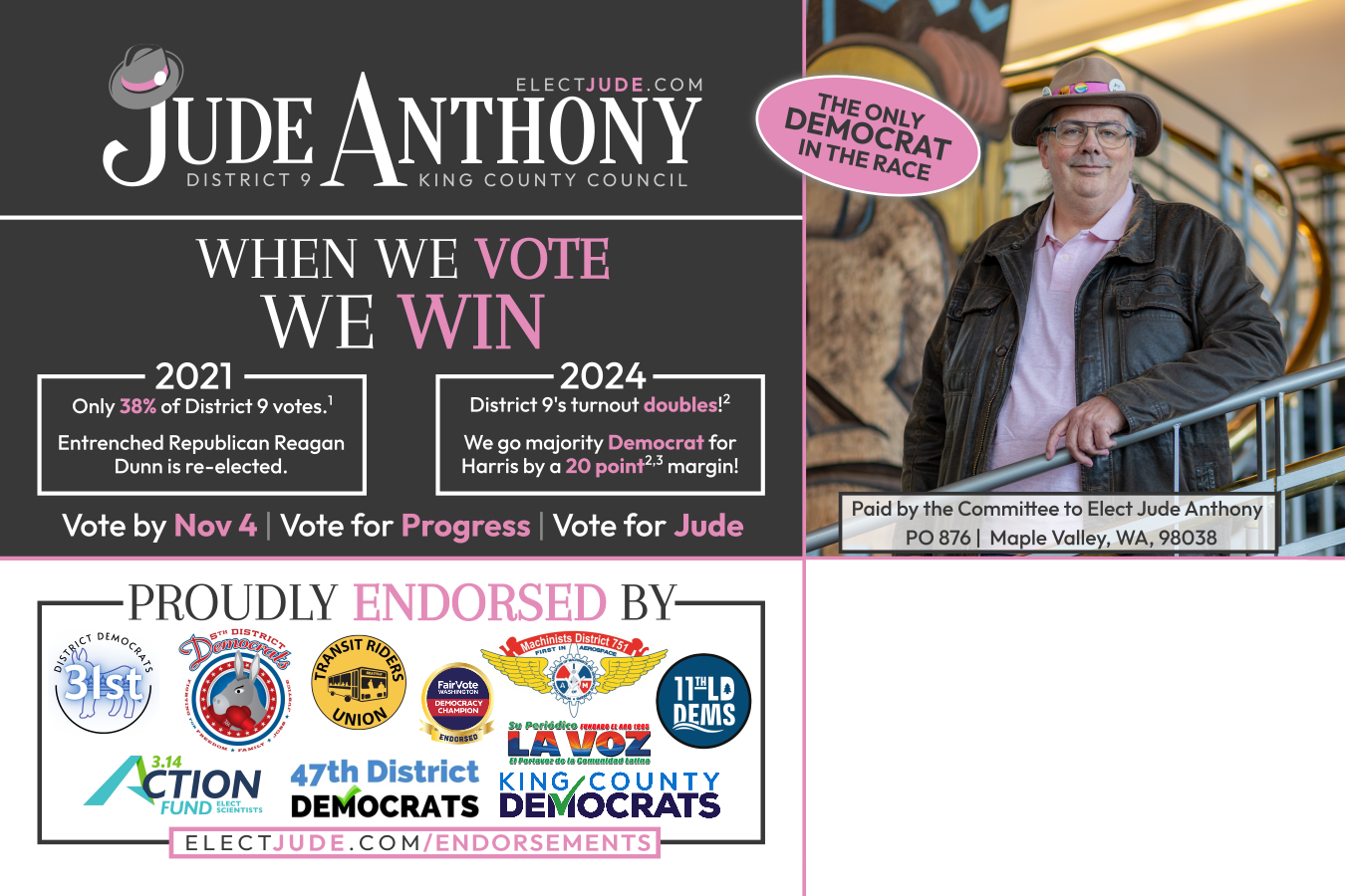 Along with the 4 endorsements listed on the mailer, Jude is endorsed by The Stranger, the Democratic Party in 4 LDs, and several other non-political-party groups and individuals that you can find on the Endorsements page.