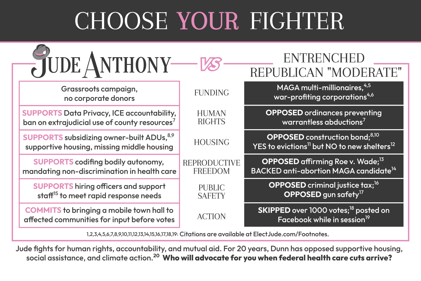 Where Reagan Dunn was the sole no vote on a (non-binding) resolution affirming Roe v Wade, and even joined “Don’t Say Gay” governor Ron DeSantis’s presidential campaign (yes, the one who signed a 6-week abortion ban), Jude has been consistently supportive of human rights and bodily autonomy, including the rights of abortion, gender affirming care, and general medical care access.