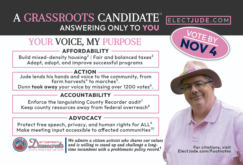 Beyond endorsements, Jude also received the 2025 Moms Demand Action Gun Sense Candidate Distinction, and is recommended for this position in the Progressive Voter’s Guide -